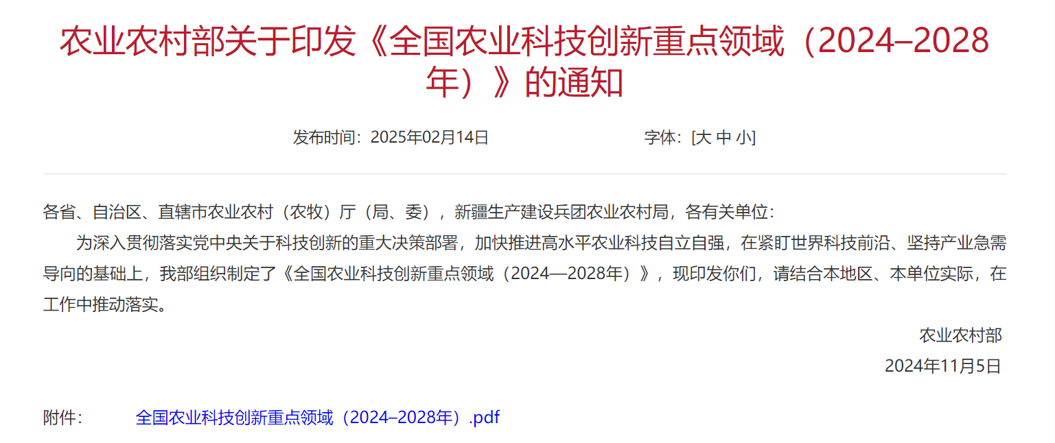 《全国农业科技立异沉点范畴(2024–2028年)》聚焦农业新品种培育、耕地质量提拔、农机配备研制、农做物病虫害防控、畜禽水产疫病防控、高效种植养殖、绿色低碳农业、农产物加工取食物制制、农产质量量平安、村落成长等10大沉点范畴,加速实现高程度农业科技自立自强。