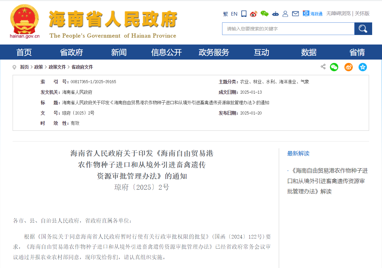 海南省农业农村厅相关担任人暗示,做为首个衔接农做子进口和从境外引进畜禽遗传资本审批权限下放的省份,海南组建了专项工做组,积极衔接该项立异性工做,正在隔离设备、手艺支持、查验平台、专家步队、学问产权等方面做脚预备,同时环绕审批人员,放置审批营业、共两批次赴农业农村部实训,而且熟练控制了审批流程、工做要点;环绕《审批办理法子》开展政策解读、营业指点,确保种业企业、科研院校等从体尽快熟悉政策,控制营业流程,享受政策盈利;环绕审批系统,取农业农村部做好沟通对接,打通“海易办”等政务平台取部审批系统堵点,进口申请从体可间接通过平台正在线上提交申请,省农业农村厅完成审批后,批件间接反馈给申请从体,整个流程全面电子化,实现“零跑腿”。海南省农业农村厅将会同海南省营商扶植厅、海口海关、三亚市等,进一步阐扬海南商业港“一线铺开,持续提拔农做子、畜禽遗传资本进境便当化程度,进一步推进事中过后监督工做,切实帮帮种业企业、科研院校等从体降低种子引进时间成本,把南繁硅谷打形成为我国种业科技自立自强、种源自从可控的立异高地。