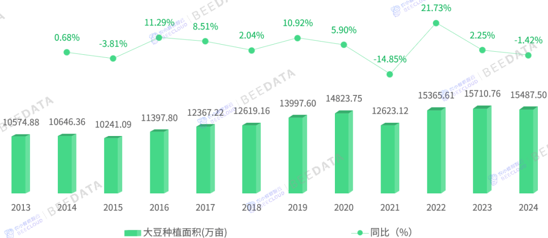 2024年,中国大豆种植面积为15487。5万亩(约合1。55亿亩),同比力2023年削减了1。42%,虽然大豆种植面积较上年度略有削减,但仍然连结正在较高程度,取2013年的10574。88万亩(约合1。06亿亩)比拟,近11年间添加4912。62万亩,增幅约46。46%,年均复合增加率约3。53%。近年来,因为政策的支撑和农业手艺的前进,大豆种植连结不变,出格是正在东北地域,大豆种植仍然是次要的农业勾当之一。