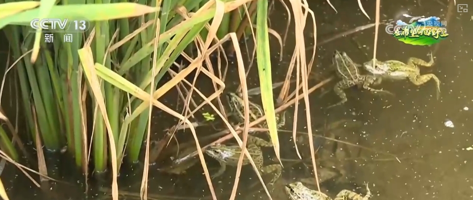 小鸭子们喜好吃稻谷,这里采用的模式是“鸭蛙稻”模式,5月放鸭、7月放蛙,正在水稻进入抽穗期,也就是有稻谷的时候,15万只小青蛙就会来接力办理这片农田,由它们来捕食害虫,替代杀虫剂。