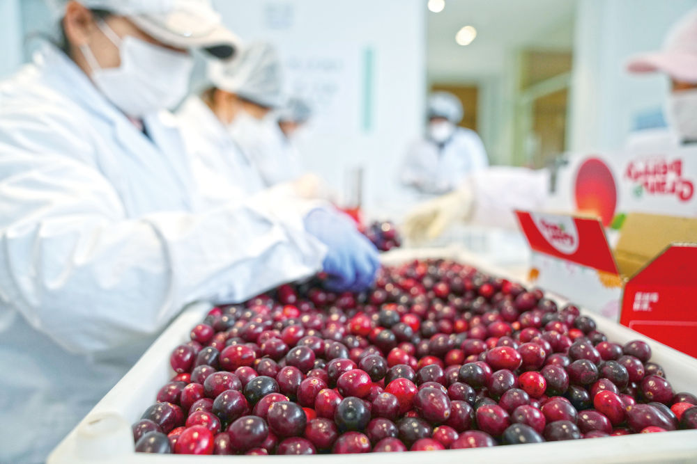 工做人员正正在挑选蔓越莓鲜果。她说,配车、配翻译、住酒店,还有娇贵的蓝莓。