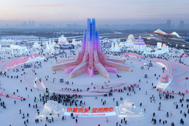 2025年1月5日,正在冰雪大世界园区,旅客正在从塔“亚洲齐心”附近玩耍(无人机照片)。记者 谢剑飞 摄。