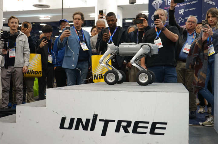 2025年1月8日,正在2025年美国拉斯维加斯消费电子展(CES)上,人们正在中国企业宇树科技的展区旁不雅机械狗展现。发(曾慧摄)。