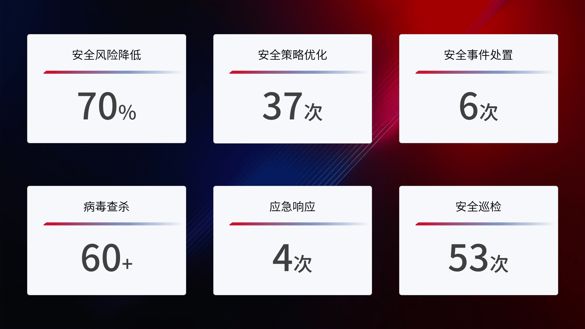 提供全面的安全事件报告体系,,,,包括处置报告、、、、周报、、、、季度和年度总结,,结合持续监控,,,,帮助客户深入了解网络安全状况。。