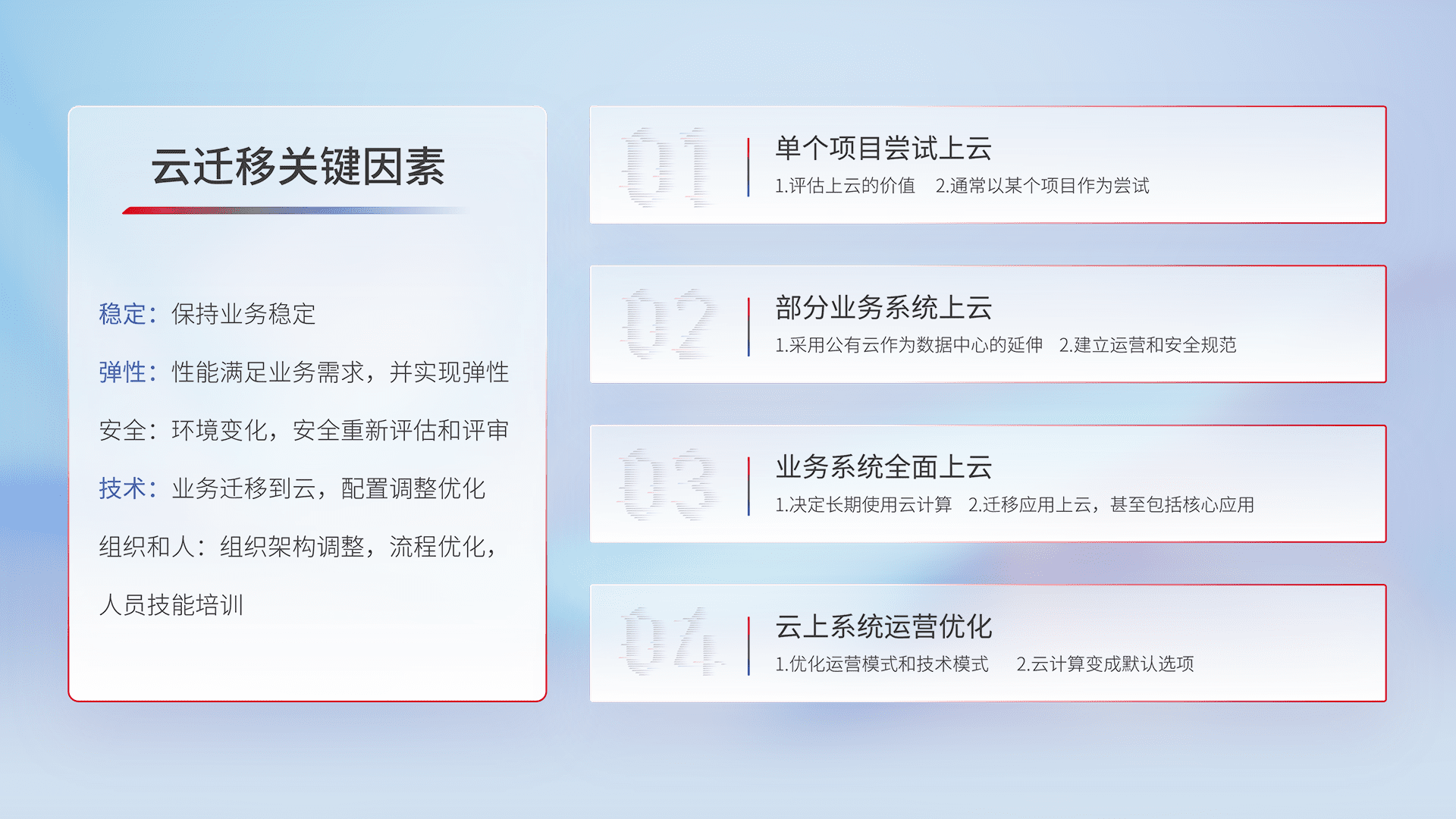 结合实际业务,,,从规划设计、、、云平台选型、、、、云原生改造、、数据迁移、、集成交付,,,,迁移全过程为客户识别最佳上云路径,,,做好风险识别管理,,设计网络架构、、、身份权限、、、、安全审计合规、、、操作审计、、、日志审计、、、监控告警策略、、、、多站点容灾设计等,,,,对云上基础设施进行整体规划,,,,提升IT治理水平,,,以满足弹性、、、、高可用、、、、高性能的需求。。。。
