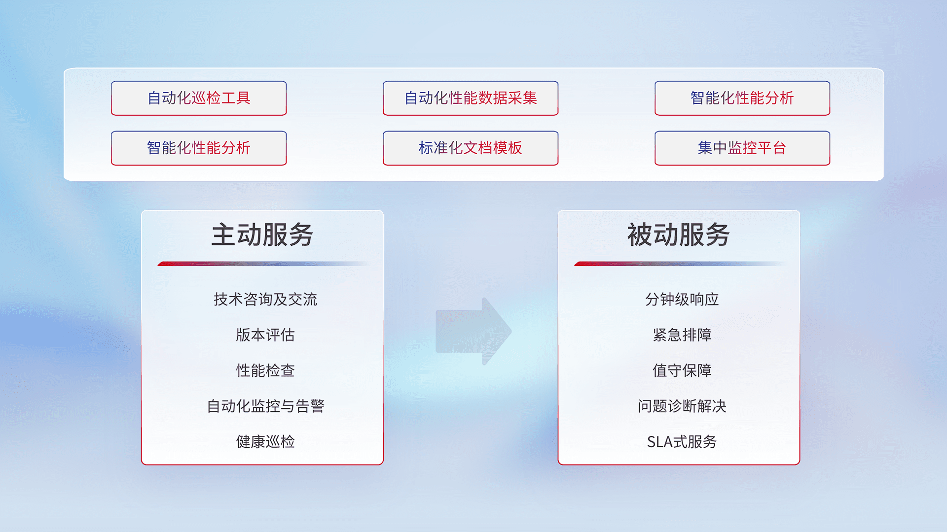 智能化工具和标准化文档,,保障服务质量,,,,提供主动服务(包含技术咨询、、、版本评估、、、性能检查、、自动化监控与告警、、、健康巡检)和被动服务包含(分钟级响应、、、、紧急排障、、值守保障、、、问题诊断解决、、、、SLA服务)。。。。